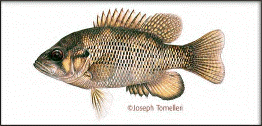 caught by anglers. The orange sunfish is a brightly colored sunfish found spotted primarily in turbid, mud-bottomed pools. It is seldom sought since it doesn't exceed four inches in length. The spotted sunfish is also small, rarely over six inches long, but is occasionally caught in areas with lots of cover. |