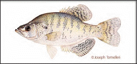 species look very similar, but the white crappie is paler in colors, with dark spots on the silver sides usually arranged in regular vertical bars. The best way to distinguish the two species is to count the dorsal fin spines. White crappies typically have six, and black crappies usually have seven or eight. Like the bluegills the crappie tastes wonderful when freshly cooked on a grill. |