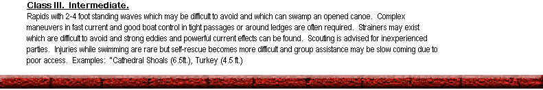 Moderately fast moving water with riffles and small waves. Few obstructions, all obvious and easily missed with little training.